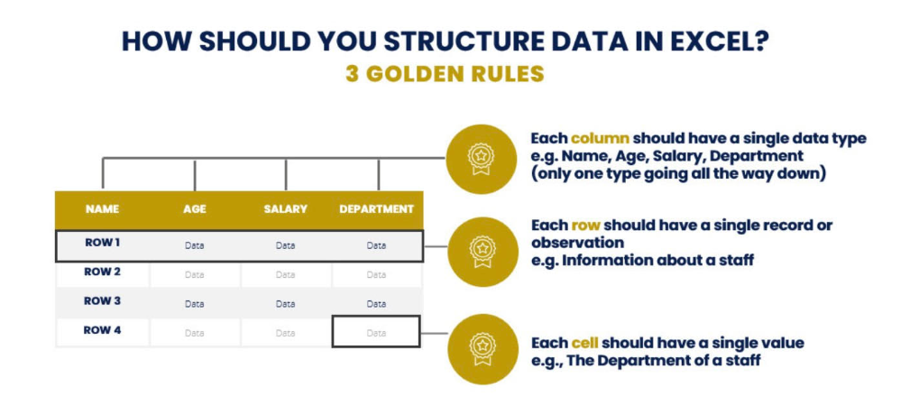 - В каждой ячейке одно значение. Если там текст, то не должно быть чисел или других данных. Если вы вводите адрес, города и индексы должны быть в разных столбцах. Тогда вы сможете фильтровать и анализировать данные отдельно по городам и индексам.