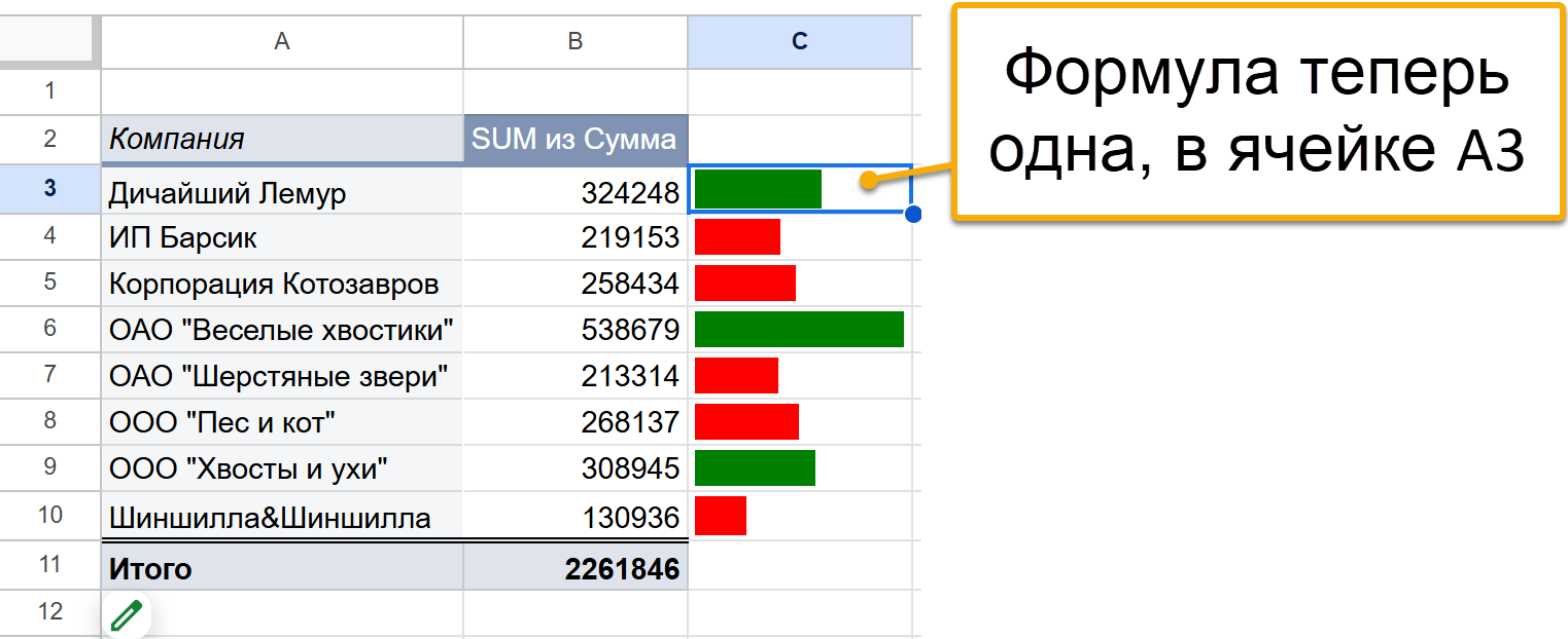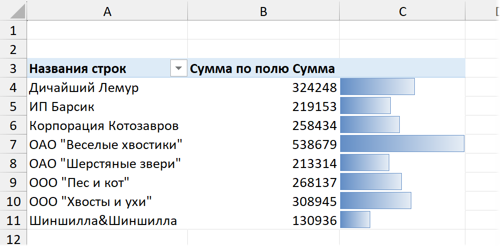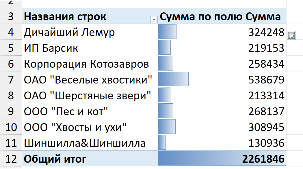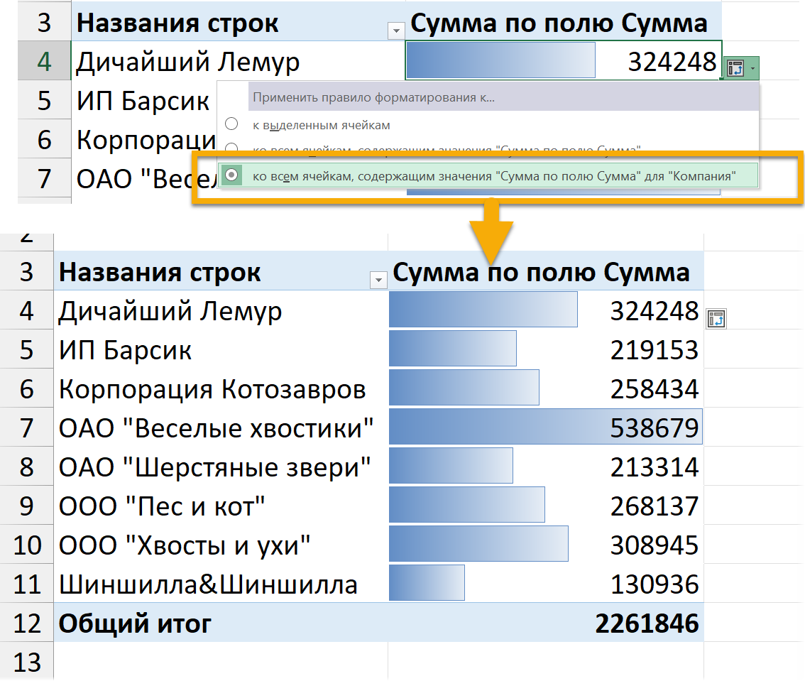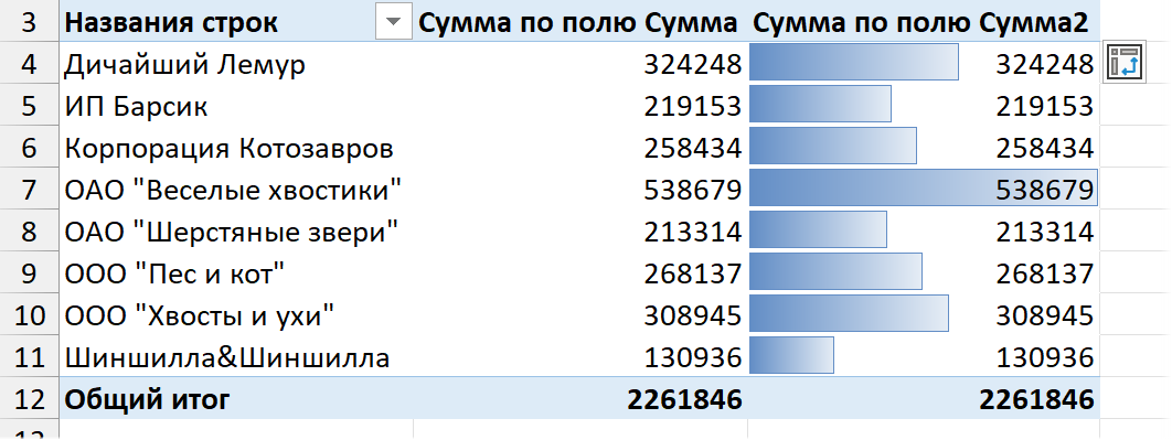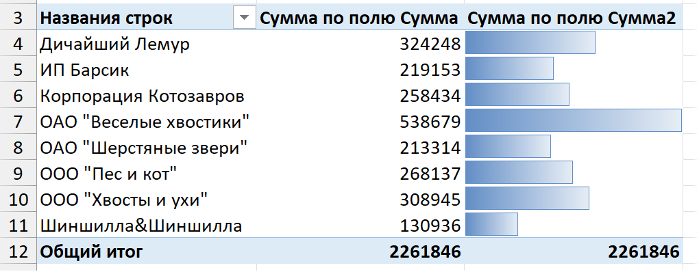 =map (A3:A;B3:B;lambda (a;b; ЕСЛИ (ИЛИ (a="Итого";ЕПУСТО (a));""; SPARKLINE (b;{"Charttype" \ "bar"; "max" \ НАИБОЛЬШИЙ ($B$2:$B;2); "color1" \ ЕСЛИ (b>СРЗНАЧЕСЛИ ($B$2:$B;"<"&МАКС ($B$2:$B));"green";"red") })))) | | | | Сводные таблицы Excel: гистограммы | | | | В Excel есть гистограммы условного форматирования (Data Bars), которые можно вставлять прямо в ячейки. В том числе и в сводных!