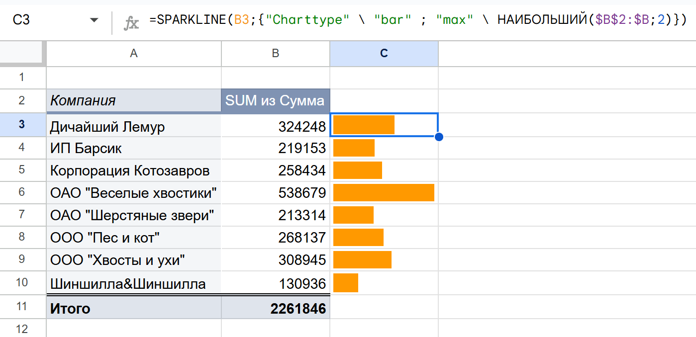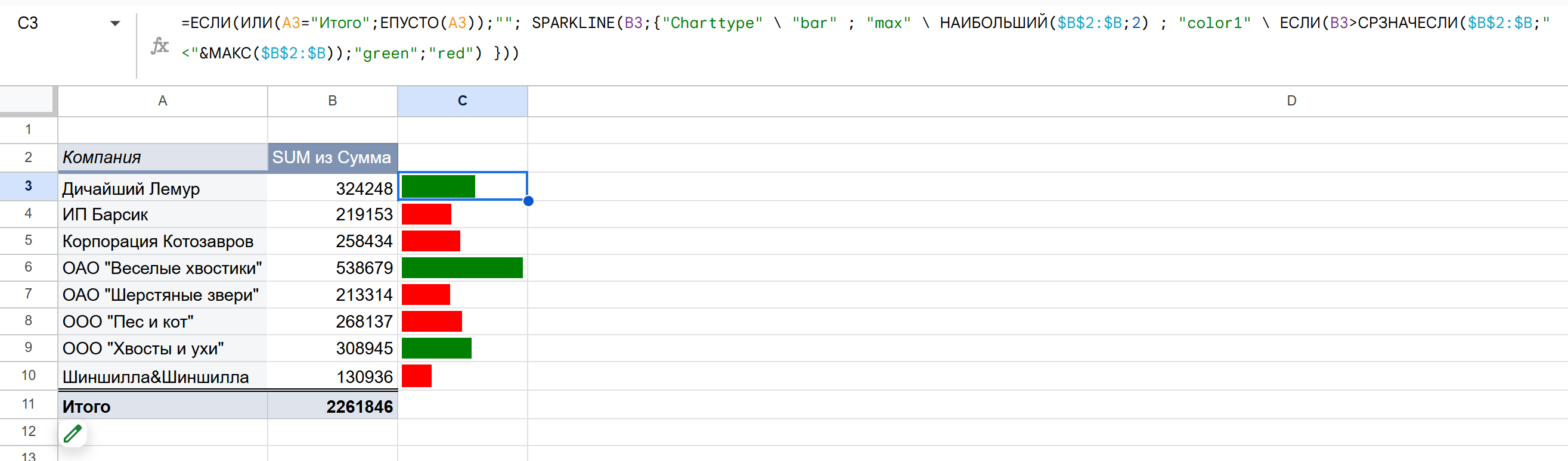 Но в любом случае, если мы такую формулу дотянули бы до 11-й строки с итогами, спарклайн отобразился бы там — а он нам там не нужен. Так что если мы ожидаем появления новых элементов, можно добавить проверку — если в столбце A «Итого» или пусто, не отображаем ничего, а если не пусто — то спарклайн:
