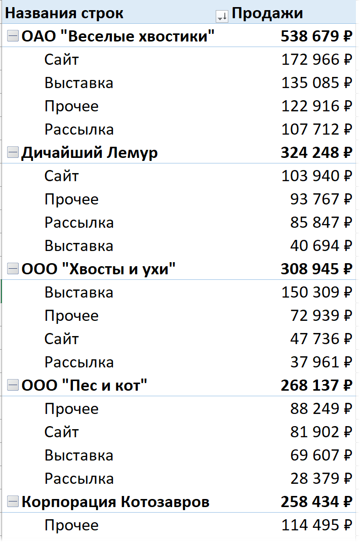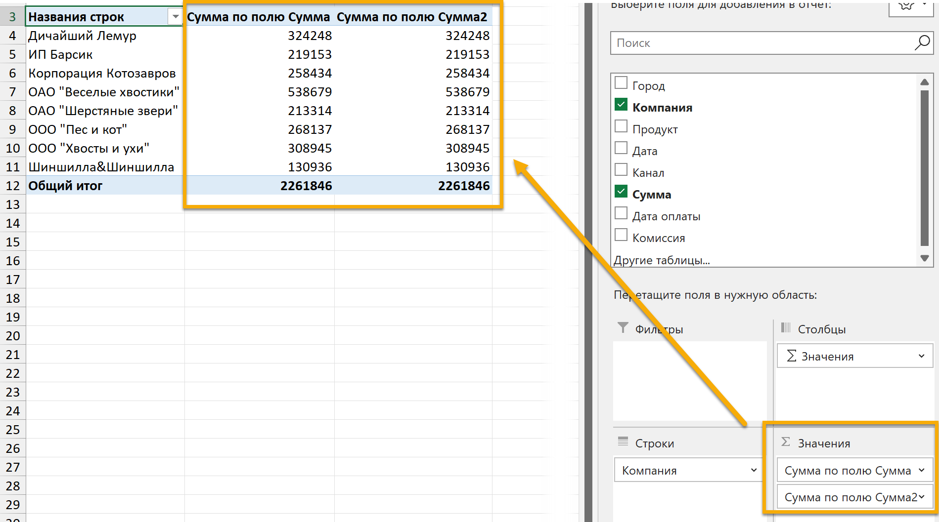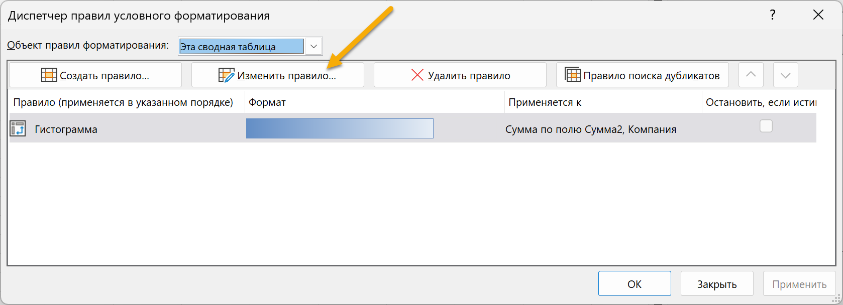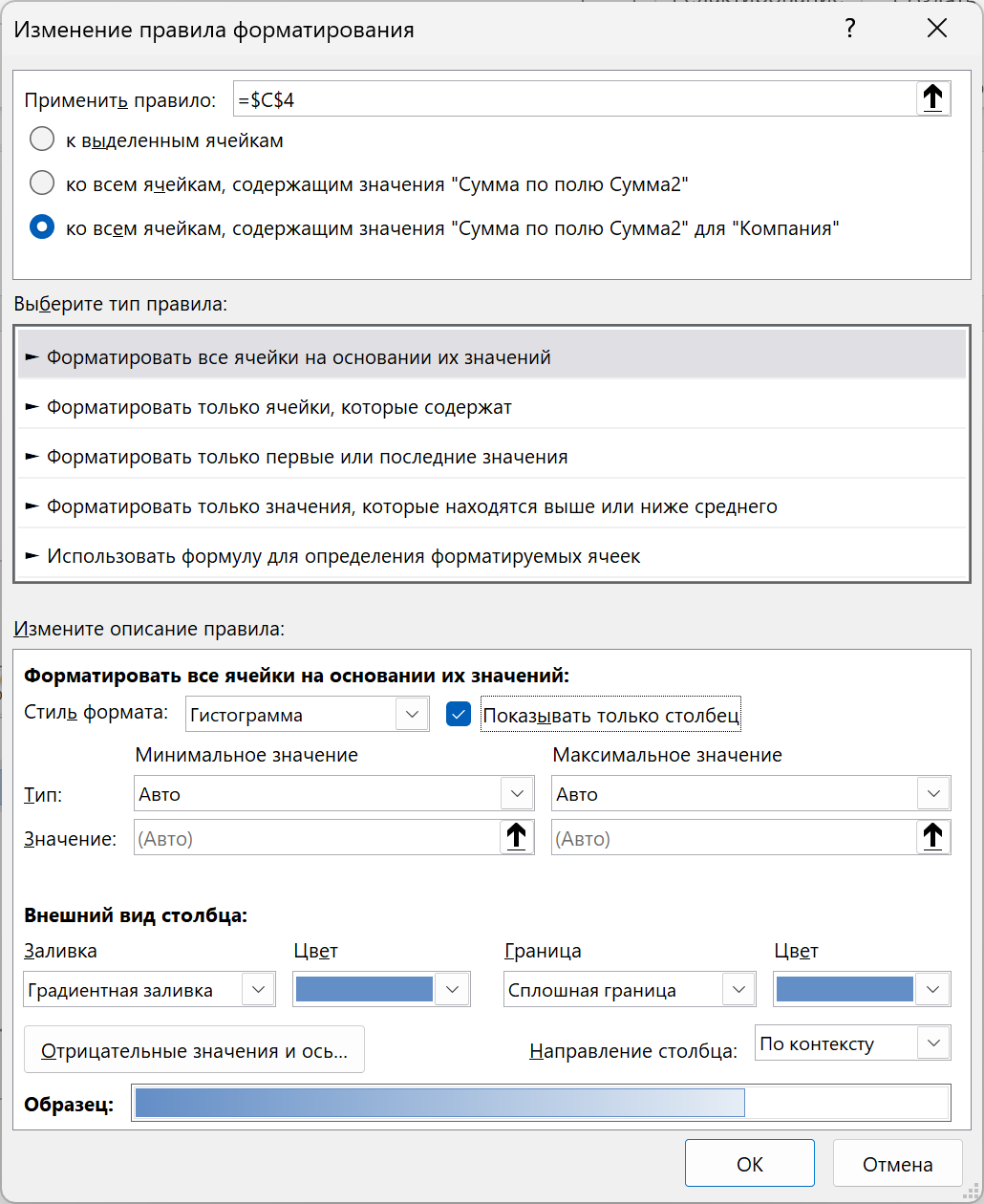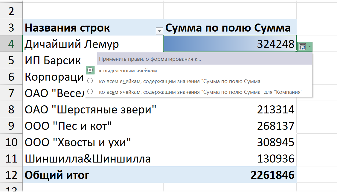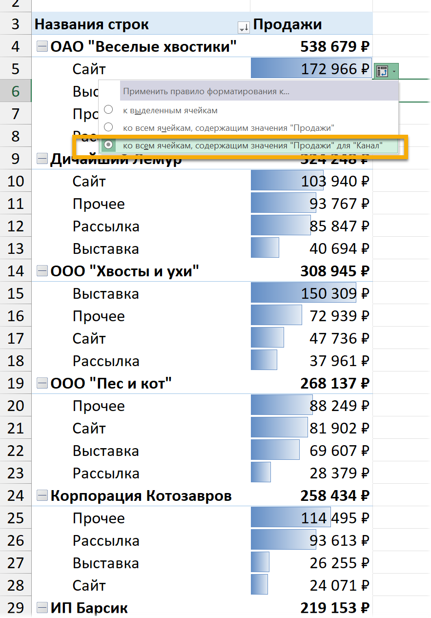 Не нужно выделять заранее все значения в нужном поле сводной — просто выделите одну ячейку и вставьте гистограмму нужного цвета. После чего справа появится кнопка (смарт-тэг) — там будет три варианта: | | | | По умолчанию — «к выделенным ячейкам». Если выбрать второй вариант, то гистограммы будут везде, включая общий итог, что не очень корректно, как мы обсуждали выше: | | | | Конечно, если бы у нас была не сумма, а среднее, допустим, то можно и к итогу тоже применить гистограмму. Но не тут. Так что выберем третий вариант — это будут гистограммы только на уровне компаний, без общего итога: | | | | Такой вариант пригодится и в случаях, когда у вас несколько уровней в области строк сводной таблицы: | | | | Здесь на первом уровне клиент, а на втором канал продаж. Если применить ко всему полю (выбрав второй вариант в списке после вставки одной гистограммы либо выделив сразу все ячейки подряд), то опять получится, что мы сравниваем части целого с целым. Если мы хотим сравнивать только значения второго уровня, вставляем гистограмму в любую ячейки с таким значением: | | | | А что если вы хотите, как это получается со спарклайнами в Google Таблицах, не применять гистограммы «поверх» сумм, а в отдельных ячейках сбоку? Простой маневр: добавляем такой же столбец с суммами, просто дублируем его, еще раз перенося в область значений нужный столбец (который суммируем): | | | | И применяем гистограмму к любому из них (очевидно, к правому будет логичнее): | | | | А после идем в Условное форматирование — Управление правилами — там находим соответствующее правило и кликаем дважды на него (или один раз на «Изменить правило»): | | | | В появившемся окне с параметрами включаем флажок «Показывать только столбец» (Show Bar Only): | | | | Можно убрать итог (либо убрать совсем из отчета сводной таблицы через вкладку «Конструктор», либо применить числовой формат «;;;» к столбцу «Сумма по полю Сумма2») и заголовок «Сумма по полю Сумма2» ввиду его бессмысленности (можно просто поставить пробел вместо него): | | | | Тренинг в Москве 24−25 мая: остается 5 мест с книгой в подарок | | | | Путешествие по Европе. Запад, юг и Балканы | | | | Ездили в гости; так как сейчас выбираться из России за границу недешево — я всегда стараюсь «зацепить» новые страны по пути, так как внутри Европы лоукостерами зачастую можно летать за 3−4 тыс. рублей.
