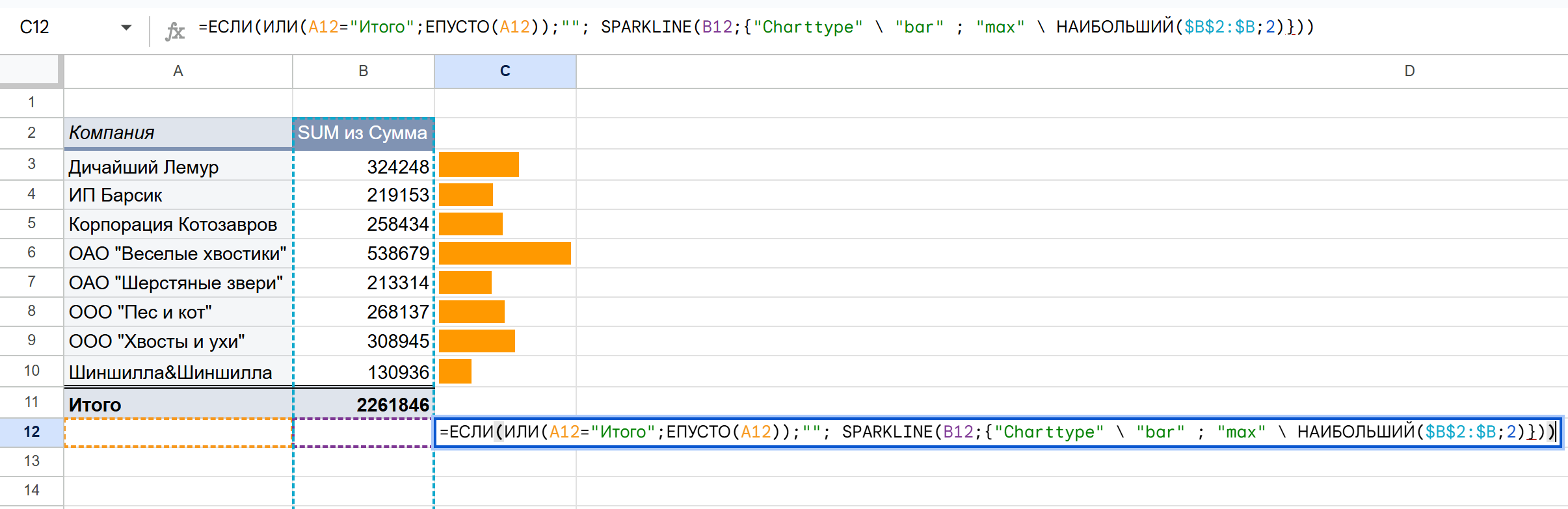 =ЕСЛИ (ИЛИ (A3="Итого"; ЕПУСТО (A3));""; SPARKLINE (B3;{"Charttype" \ "bar"; "max" \ НАИБОЛЬШИЙ ($B$2:$B;2)})) | | | | В 12 и следующих строках пусто, хотя формула там есть.