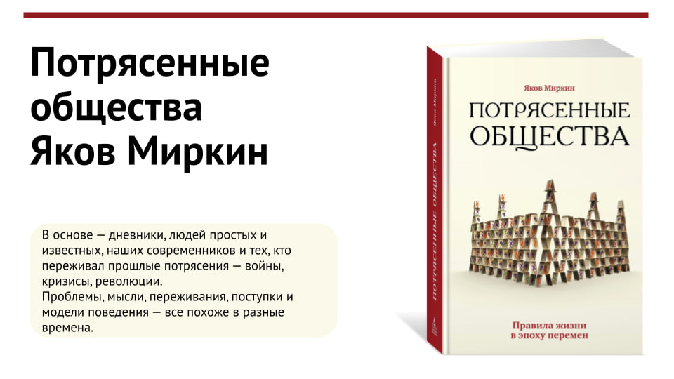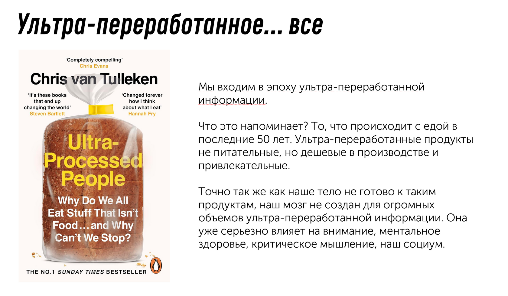А вот вам несколько моих слайдов с выступления на той же сцене: | | | Дочитал книгу Якова Миркина «Потрясенные общества». Очень воодушевляющее, интересное, познавательное и полезное чтение. Тема грустная — потрясения последних пары столетий — но книга пропитана оптимизмом, любовью к человеку, созидательным настроем. И основана на дневниках людей — известных и простых — которые очень похожим образом переживали и выживали в 1905, 1941, 2022 и в другие времена. Подробнее про книгу, цитаты — тут: https://t.me/nofictionhere/29 | | | Прочитал книгу про здоровье кишечника. Много оценок на Амазоне. Но я не могу рекомендовать тратить на нее (тем более что на нее пришлось тратить доллары, а не рубли!) В целом ничего нового — ешьте ферментированные продукты, не ешьте сладкое и переработанные. Не то чтобы книга порадовала. Но в очередной раз пробую улучшить рацион ради результатов на соревнованиях (добиться соревновательного веса), в рекомендациях именно по здоровью кишечника я доверяю ученому Диме Алексееву (вот наш подкаст с ним, а это его канал) А по еде стараюсь просто придерживаться максимального разнообразия, натуральных продуктов, не страдать чрезмерными ограничениями, но минимизировать сладкое и тесто. По Поллану, короче говоря! | | | | Лайфхак: ограничение времени на задачи | | | | Когда в моем списке задач (он у меня на день, ближе к вечеру я готовлю список на следующий день) становится слишком много пунктов, я добавляю к каждому пункту время на его выполнение. Обычно от 15 минут до полутора часов, но бывают и исключения в обе стороны.