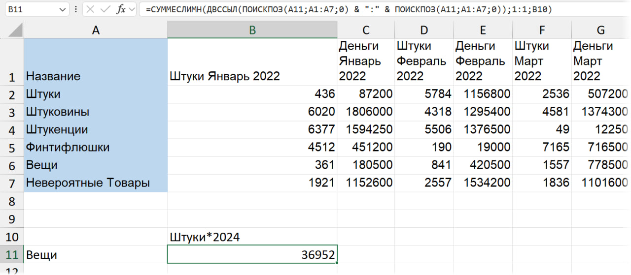 =СУММЕСЛИМН (ДВССЫЛ (ПОИСКПОЗ (A11;A1:A7;0) & ":" & ПОИСКПОЗ (A11;A1:A7;0));1:1;B10)