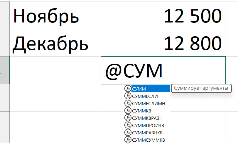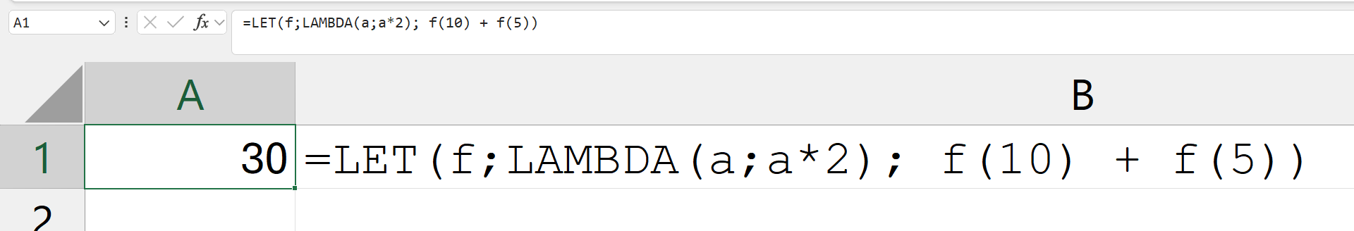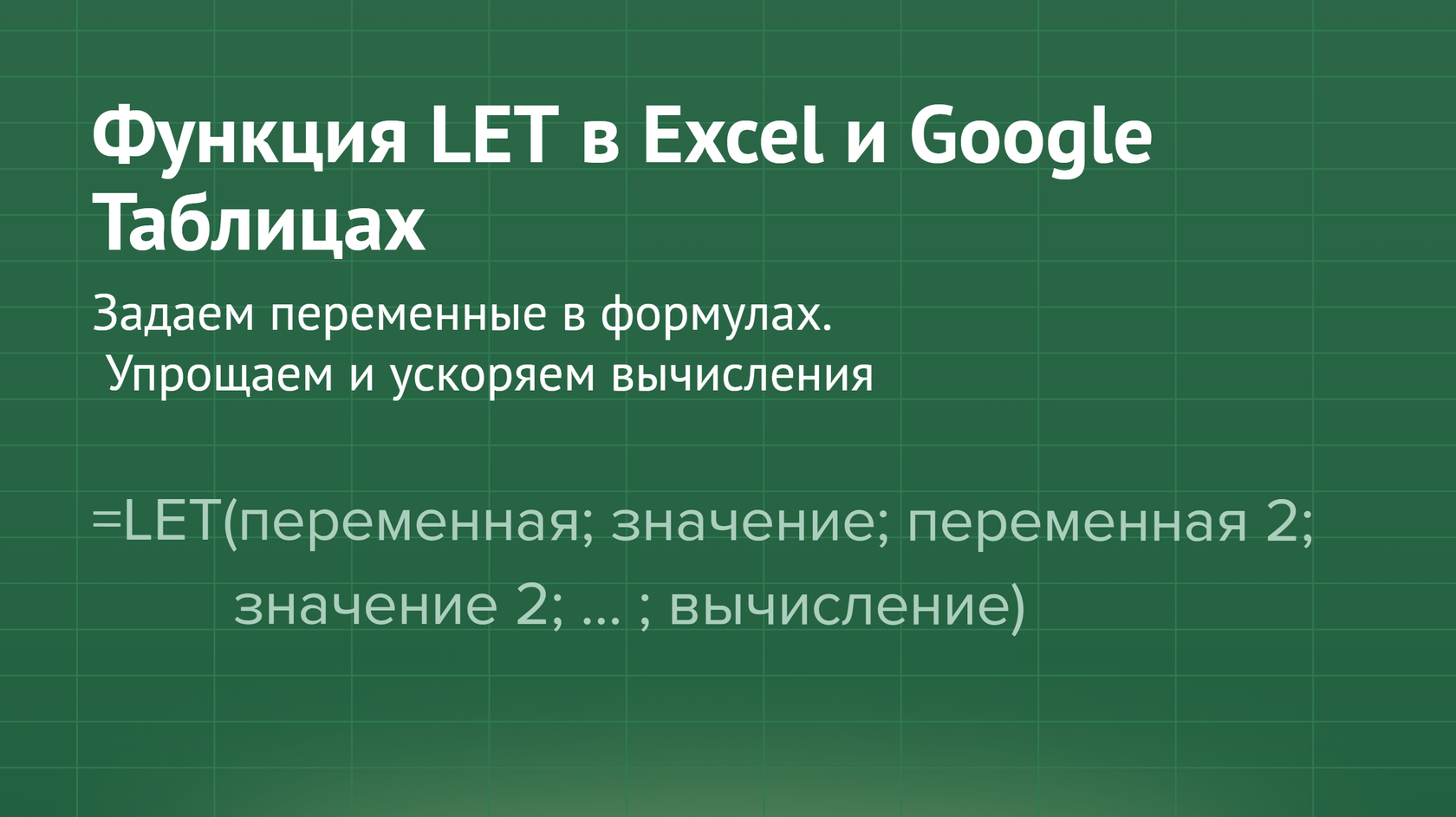 Если захотите секунд на 5 заглянуть в прошлое и найти связь Excel с VisiCalc — она есть не только в названиях функций. | | | | Введите @ (а именно так начинались формулы в VisiCalc) и вводите название функции (например, СУММ) — и увидите, что собачка работает как знак «равно», вы вводите формулу. | | | | Функция LET. Переменные и именованные функции внутри формулы | | | | В ситуациях, когда в формуле приходится использовать какой-то промежуточный результат много раз, пригодится новая функция LET. Она есть в Excel 2021/2024/365 и Google Таблицах.