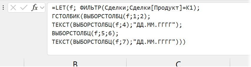 Давайте посмотрим на совсем простой пример — зададим две переменных a и b, присвоим им значения 50 и 10 и вычислим их произведение в последнем, единственном непарном, аргументе функции LET: | | | | Конечно, такую задачу можно решить и без LET. А нужна она для ситуаций, когда вы вычисляете в рамках формулы одно и то же много раз. Например, у вас ФИЛЬТР / FILTER, которая возвращает выборку из исходной таблицы, и вы потом из этого, уже виртуального отфильтрованного массива, получаете отдельные столбцы (через ВЫБОРСТОЛБЦ / CHOOSECOLS), как-то их объединяете (например, через ГСТОЛБИК / HSTACK) и так далее. И вот чтобы не вычислять ФИЛЬТР каждый раз, а сделать это единожды, можно использовать LET: | | | | А вот что еще интересно: в LET можно задавать свои функции! Это, конечно, экзотика, но тем не менее.