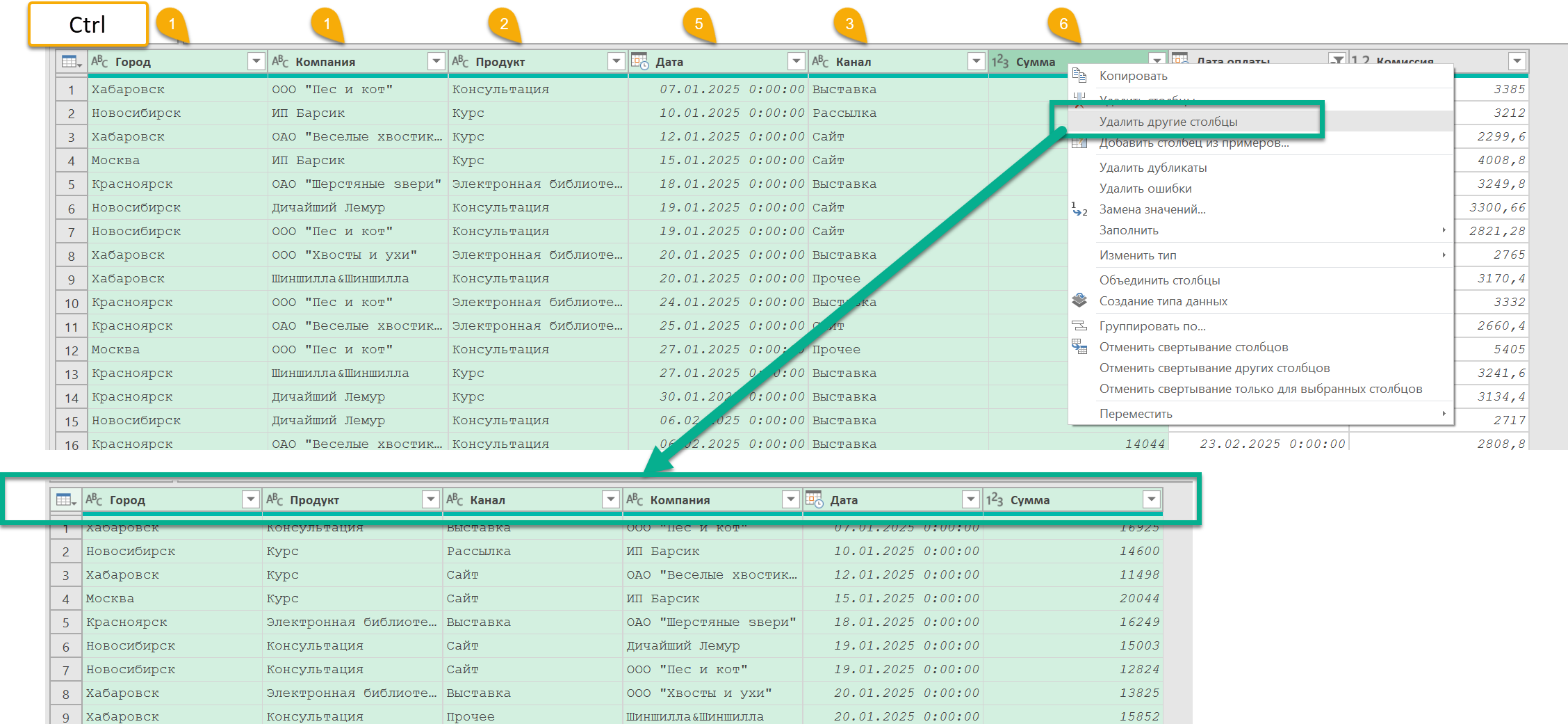 Зажимаем Ctrl, выделяем столбцы, которые нужно оставить, и делаем это в том порядке, в каком нужно, а затем правая кнопка мыши и "Удалить другие столбцы".